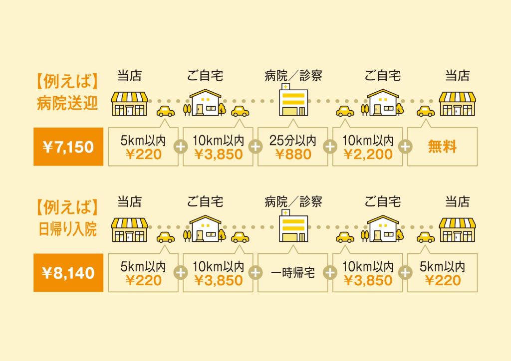 | 1回(3kmまで) | ¥550 | 片道分 (迎・送の場合は×2となります) |